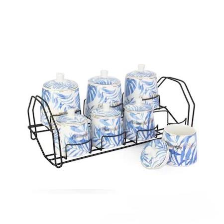 ACAR 7 PARÇA MAVİ TROPİK DESEN PORSELEN STANDLI BAHARAT TAKIMI